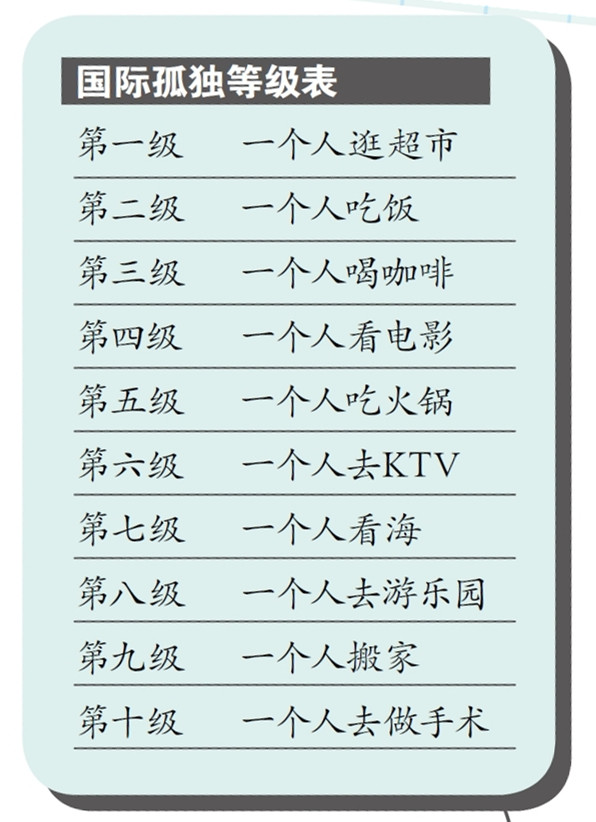 “平时一个人上下班,吃饭主要靠叫外卖,有空就和朋友们微信聊天、玩玩游戏。虽然常感到孤独,但很少会约着一起逛街、看电影。”“孤独得像条狗,和Siri做朋友。”这样的生活状态在“空巢青年”中属于常态,甚至在网上还流行着一张很有共鸣的“孤独等级图”。